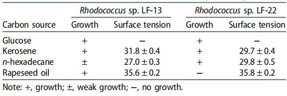 两种细菌菌株红球菌属。 菌株 LF-13 和红球菌属。 当以煤油作为唯一碳源和能源时,菌株 LF-22 能够将培养基的表面张力降低约 40 mN m-1。 因此,它们被选择用于进一步表征生物表面活性剂的生产。 为了拓宽生物表面活性剂生产的底物范围,测试了除煤油和葡萄糖之外的其他碳源(表 3)。 这两种菌株可以在葡萄糖上生长,但不合成生物表面活性剂。 他们能够在正十六烷和菜籽油上产生 SAC,即使菜籽油不支持菌株 LF-22 的生长。