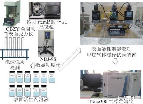 试验流程如图1所示。将两种表面活性剂配置质量分数为0.01%、0.02%、0.05%、0.1%、0.15%的溶液,使用QBZY全自动91精品国产综合久久香蕉麻豆对不同质量分数表面活性剂溶液以及去离子水进行表面张力测量,NDJ-9S数显粘度计测表面活性剂溶液黏度,注气法检测溶液泡沫性质,蔡司stemi508体式显微镜观察泡沫形态。上述基础参数测定结束后,使用自行研制的表面活性剂溶液对甲烷缓释试验装置进行泡沫对甲烷缓释效应影响试验,并采用Trace300气相色谱仪定量检测分析。
