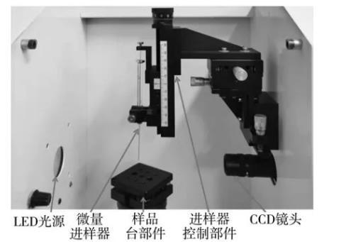 实验采用SL200A型接触角仪来产生液滴,获取液滴图像。该仪器的主机如图2所示,主要组成部件为:光源控制部件(可调亮度LED光源)、CCD镜头(75 mm焦距,25帧/秒)、进样器控制部件(可升降12.5 mm,0.01 mm微距)、样品台部件(样品台面50×50 mm)、图像采集卡(25帧/秒)、手动控制微量进样器(10、25、50μL)。实验采用表面张力与接触角分析系统的CAST2.0软件控制拍摄过程。采用连续拍摄方式,图像采集速率为25帧/s,连拍100帧,获取液滴图像。实验样品为黏度系数为50 mm2/s、100 mm2/s、350 mm2/s、500 mm2/s的硅油,其中黏度系数为50 mm2/s、100 mm2/s的硅油密度σ为965 kg/m3,黏度系数为350 mm2/s、500 mm2/s的硅油密度σ为970 kg/m3[14]。