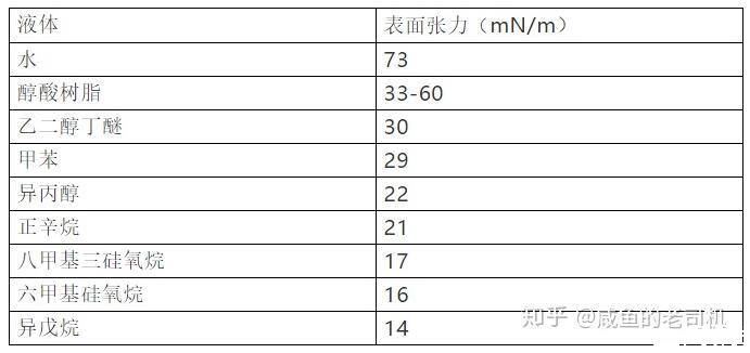 常见液体物质的表面张力