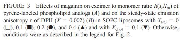 除上述相似性外,当使用芘标记的脂质类似物研究酸性磷脂对脂质动力学的影响时,两种肽之间也存在明显差异。Magainin 2导致两性磷脂组成的LUV的芘发射显着猝灭(图2A)。然而,在PG存在的情况下,芘的单体强度增加,XPG逐渐增加了这种效应的幅度(图2A)。圆二色性、拉曼光谱、傅里叶变换红外光谱和固态核磁共振研究表明,马盖宁在与脂质双层结合时采用螺旋构象(Matsuzaki等人,1989年、1991年;Williams等人,1990年;Jackson等人,1992年;Bechinger等人,1993年;Wieprecht等人,1997年;Hirsh等人,1996年)。magainin 2对两种膜的这些不同影响可能是由于1)通过与肽的带正电基团(例如赖氨酸的?氨基)直接接触使芘荧光猝灭,或2)插入双层的=-螺旋肽改变荧光团的微环境,与层平面平行,如上所述。然而,在PG存在的情况下,肽的正电荷应在与酸性磷脂形成静电复合物时被中和,从而减少由于π-阳离子相互作用导致的芘荧光猝灭。
