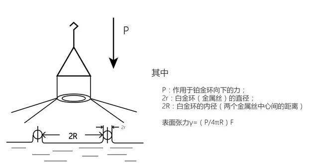 铂金环是用直径0.37mm的铂金丝做成周长为60mm的环,测试时先将铂金环浸入液面(或二种不相混合的界面)下2-3mm,然后再慢慢将铂金环向上提,环与液面会形成一个膜。膜对铂金环会有一个向下拉的力,测量整个铂金环上提过程中膜对环的所作用的最大力值,再换算成真正的表面(界面)张力值。由于铂金环法测试起来比较麻烦,测试误差也比较大,已迅速被铂金板法所取代。