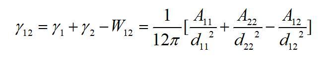 为物质1的Hamaker常数。该作用势能就相当于本体的内聚功。从表面自由能的定义不难看出,当将本体沿本体内的一个界面分开时,单位面积需要克服内聚力所做的功就等于这个作用势能。由于分开后形成两个新表面,因此每个表面上的势能等于该势能的一半。因此物体的表面自由能(表面张力)也等于该作用势能的一半,即