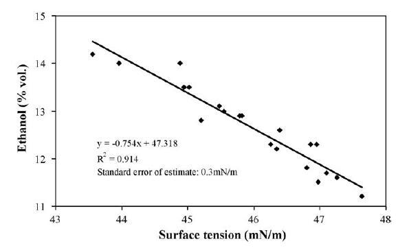 葡萄酒的表面张力值在 43.6 到 47.6 mN/m 之间变化(表 2)。 平均而言,白葡萄酒的表面张力值高于红葡萄酒(平均值分别为 46.5 和 45.0 mN/m),这一结果与文献非常一致(Andre´s-Lacueva 等,1997;Pe´ ron 等人,2000 年)。 乙醇含量最低(11.2%)的样品 W9(白葡萄酒)表现出最高的表面张力值(47.6 mN/m),而酒精强度最高(14.2%)的样品 R3(红葡萄酒)表现出最低的表面张力值张力值 (43.6 mN/m),考虑到乙醇对表面张力的影响,这是预期的结果。 样品 R3 还含有非常丰富的蛋白质和单宁,如前所述,这两种成分都会降低表面张力。 该特定样品还含有高浓度 (8.2 mg/L) 的甘油。