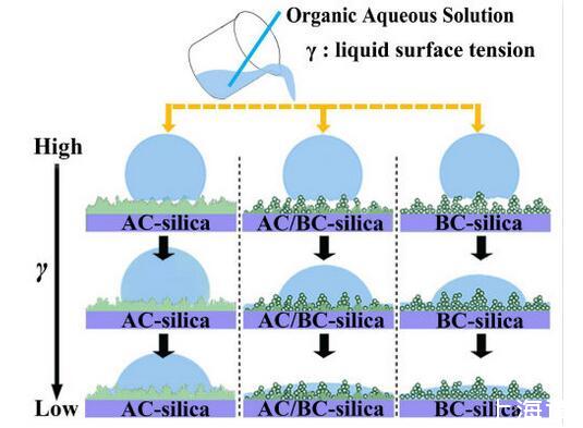 当液体的表面张力发生变化时,它在普通固体表面的润湿性也会随着变化。然而,关于这一规律以及尤其是在超疏水表面的表现的研究很少。最近,协同创新中心PI-6管自生老师课题组研究生王研等人利用上述的表面张力和润湿性的响应关系首次将透明超疏水涂层应用在探测液体表面张力方面,为拓宽多功能超疏水涂层的应用提供了一个新的思路,相关论文已被ACS applied materials&interfaces发表。研究表明,随着有机物水溶液中有机物体积分数上升,溶液的表面张力相应地下降,溶液液滴在制备的超疏水涂层的接触角也逐渐下降,此称之为表面润湿性对表面张力的响应。基于此响应关系,可以通过接触角估测液体的表面张力以及有机物的浓度。